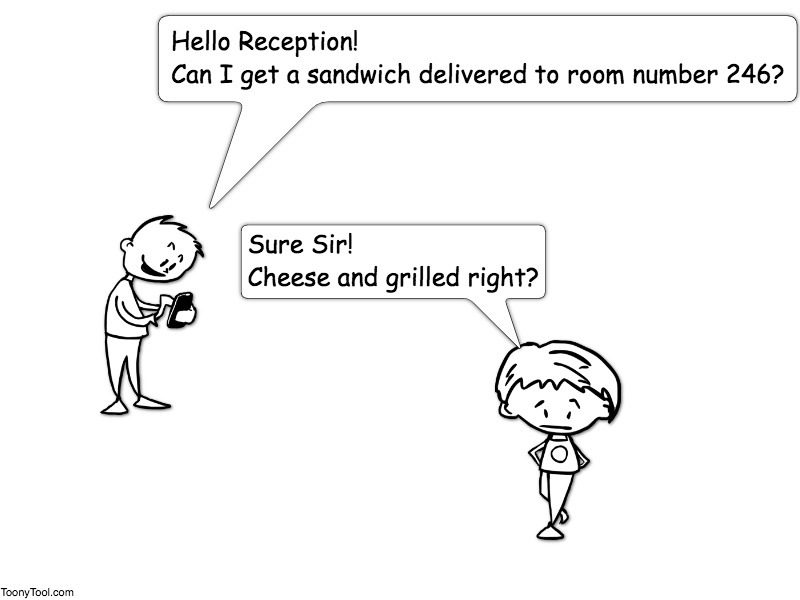 Who noticed that Mr. Das calls from his hotel room using his cell phone to reception. And tada! He gets a sandwich. Joe, our humble receptionist is best at his business.