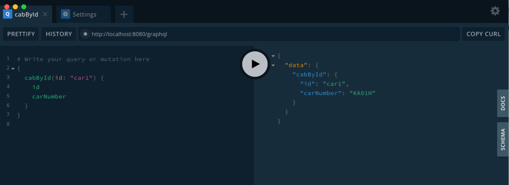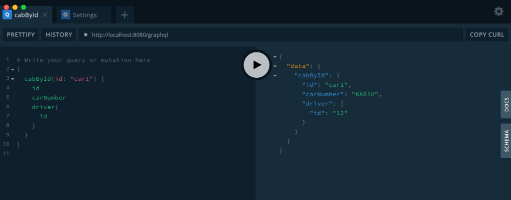 For the first screen in the mock up, we need car number based on the car Id. A simple query like the one shown below will be sufficient for the first screen. At this point, do not worry about how did that string “cabById” came into picture. And also do not worry about weird JSON like syntax. We will learn more about it as we go forward.