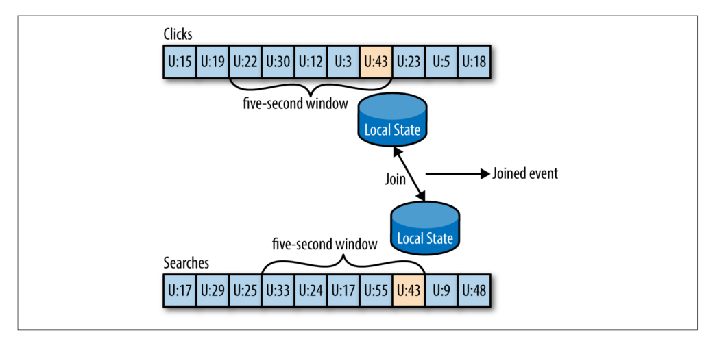 For example, let’s say that we have one stream with search queries that people entered into our website and another stream with clicks, which include clicks on search results. We want to match search queries with the results they clicked on so that we will know which result is most popular for which query. When you join two streams, you are joining the entire history, trying to match events in one stream with events in the other stream that have the same key and happened in the same time-windows. This is why a streaming-join is also called a windowed-join.